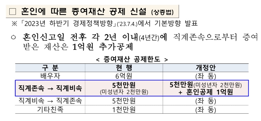 이번 혼인 증여자금 공제는 2023년 세법개정 안에 포함된 내용으로 2024년 초 시행이 예정되어 있습니다. 이번 세법 개정은 결혼·출산·양육에 대한 세제지원을 통해 인구·지역 위기에 대응하기 위해 발표되었습니다. 2023년 7월 발표된 2023년 하반기 경제정책 방향에서 기본방향이 발표되었고 7월 27일 발표된 세법 개정안에서 구체화 되었습니다.