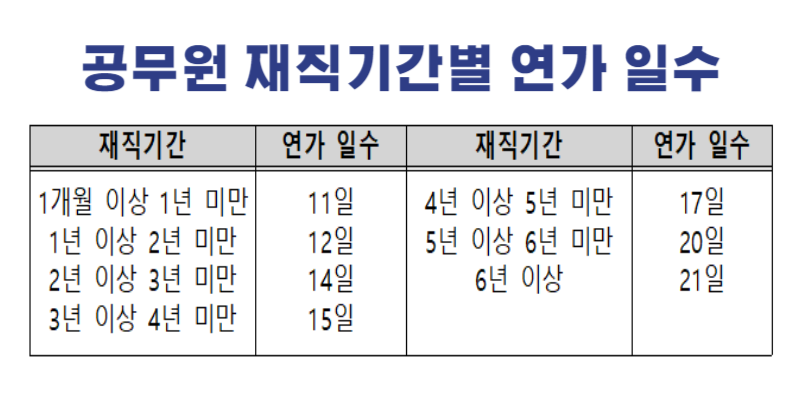 재직기간별 연가일수는 법령에 아래 표와 같이 지정되어 있어서 모든 공무원이 재직기간에 따라 동일하게 적용받습니다.