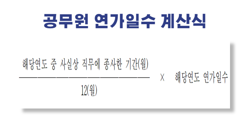 연가일수는 [해당연도 연가일수] x [해당연도 중 사실상 직무에 종사한 기간(개월)]/[12개월] 식으로 계산이 가능합니다.