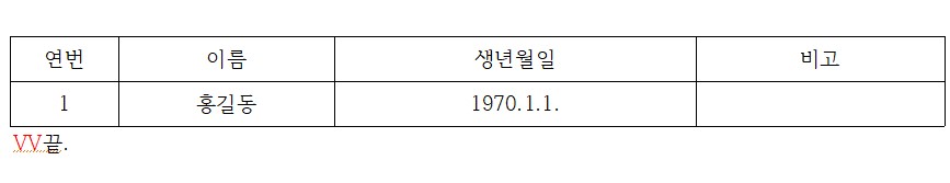 ○ 표 중간에서 기재 사항이 끝난다면 '끝'을 표시하지 않고 마지막으로 작성된 칸 다음 칸에 '이하 빈칸'으로 표시한다.