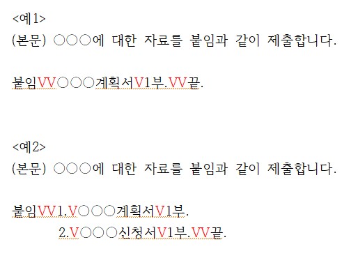 본 문서에 서식, 참고서류 같은 문서 등이 첨부될 때는 본문이 끝난 줄 다음에 '붙임'의 표시하고 첨부물의 명칭과 수량을 써넣으면 됩니다.