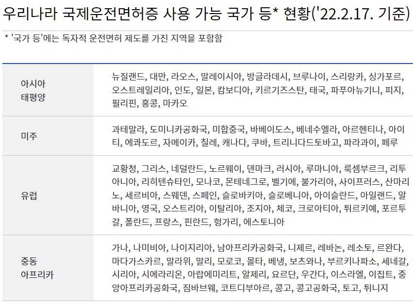 해외에서 운전할 때 모든 국가에서 국제면허증 사용이 가능한 것이 아닙니다. 제네바 협약국, 비엔나 협약국끼리만 국제면허증으로 운전이 가능하답니다. 내가 국제면허증을 사용할 나라가 여기에 해당하는지 확인하는 것이 필요합니다.