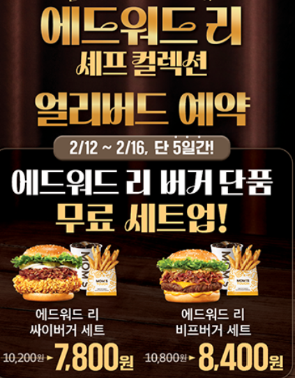 에드워드 리 셰프 컬렉션 버거 얼리버드 예약 기간은 2월 5일부터 2월 16일까지 입니다. 현재 서울 및 수도권 12개 직영점 네이버 예약을 통해 사전예약이 가능합니다. 사전예약을 완료한 고객에 한하여 2/12~2/16 기간동안 직영점에서 에드워드 리 셰프 컬렉션 버거를 30% 이상 할인 된 가격에 맛볼 수 있습니다.