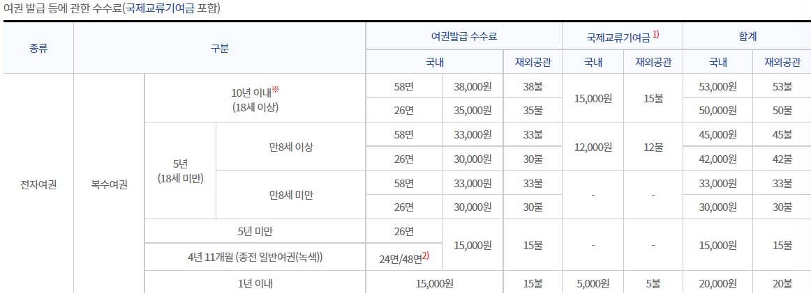가장 많이 발급 받는 10년 여권 재발급의 경우, 58면 53,000원, 26면 50,000원이다.