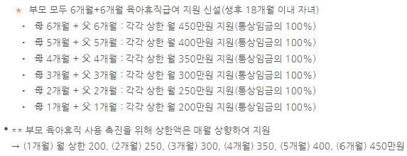 만약 기존 월급이 각각 450만원이었던 부부가 동시에 육아휴직을 쓴다면 기존 정책으로는 각각 150만원씩 총 300만원을 받을 수 있었다면, 6+6 제도 하에서는 각200만원씩 총 400만원을 받을 수 있습니다. 기본제도보다 100만원 더 받을 수 있습니다.