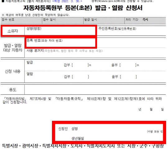 · 민원 기관을 방문하여 자동차등록원부 신청서를 작성하여 접수하면 즉시 발급받을 수 있습니다.