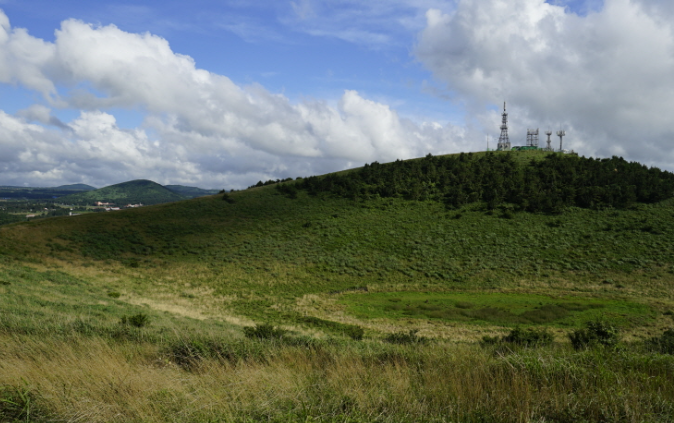 SNS에서 인기 있는 포토스팟으로 알려진 오름입니다. ‘작은 백록담’이라 불리는 산정화구호가 이곳의 최대 명소입니다. 광활한 초원과 푸른 하늘이 멋진 배경이 되는 이곳은, 특히 비가 온 후에는 움푹 들어간 부분에 물이 고여 더욱 아름답습니다. 정상에 오르면 새별 오름, 비양도, 한라산 등의 경치를 한눈에 담을 수 있습니다.