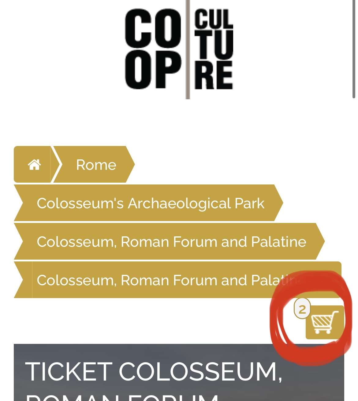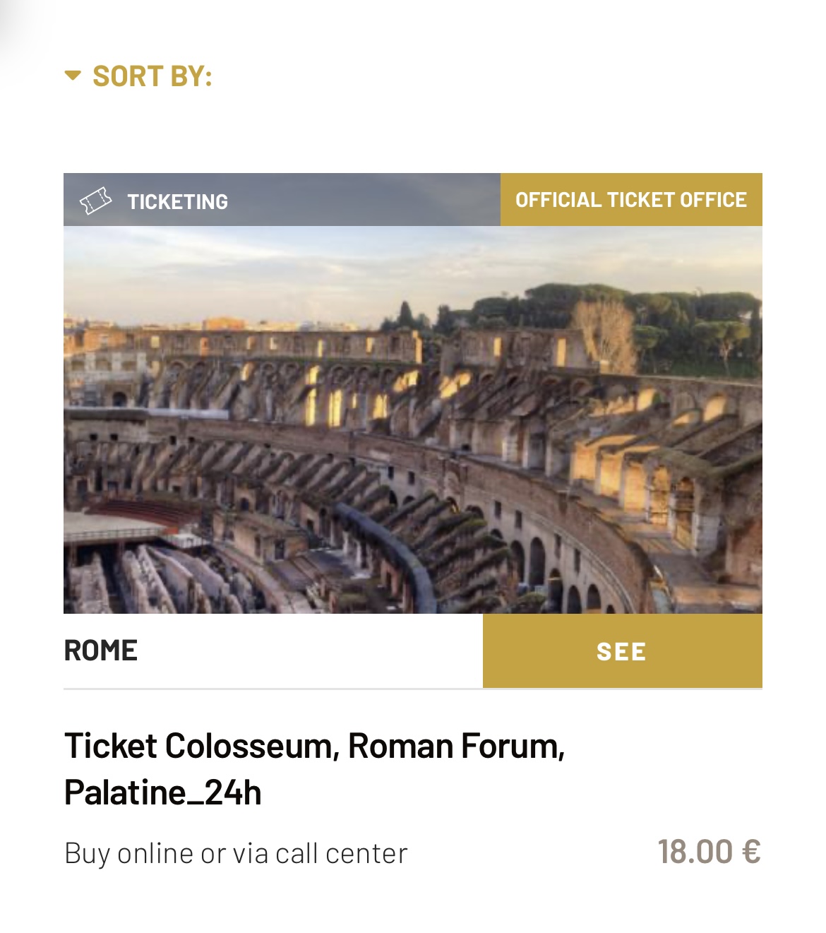 위 사이트에 들어가서 메뉴를 누르고 BUY YOUT TICKET이라는 맨 위 박스를 클릭하면 구매할 수 있는 티켓 목록이 뜬다. 우리가 예약하려는는 콜로세움 통합권은 맨 위에 나오는 18유로의 [Ticket Colosseum, Roman Forum, Palatine_24h]이다.