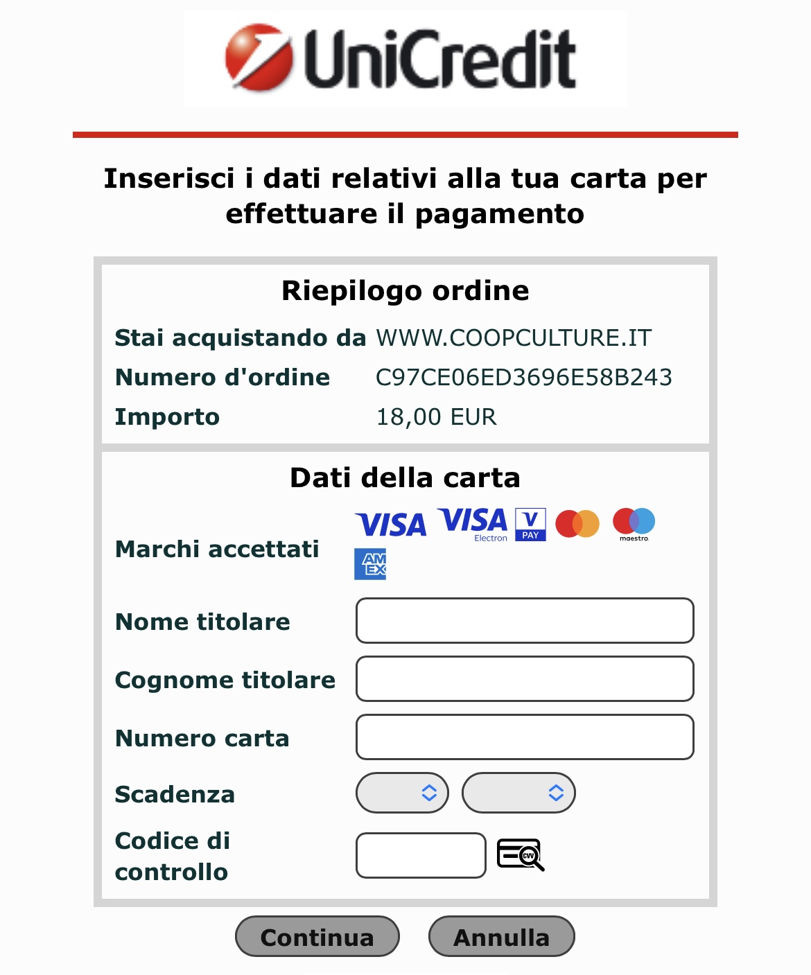 갑자기 이탈리아어로 된 카드 결제창이 떠서 당황했을 테지만 한국 결제창을 생각하면 쉽다. 차례로 이름/ 성/ 카드번호/ 카드 만료일/ CVC번호를 입력하고 continua를 클릭하면 된다. 만약 카드 결제가 안 된다면 해외 사용이 불가한 카드일 수 있으니 다른 카드로 시도해 보면 좋을 것 같다.
