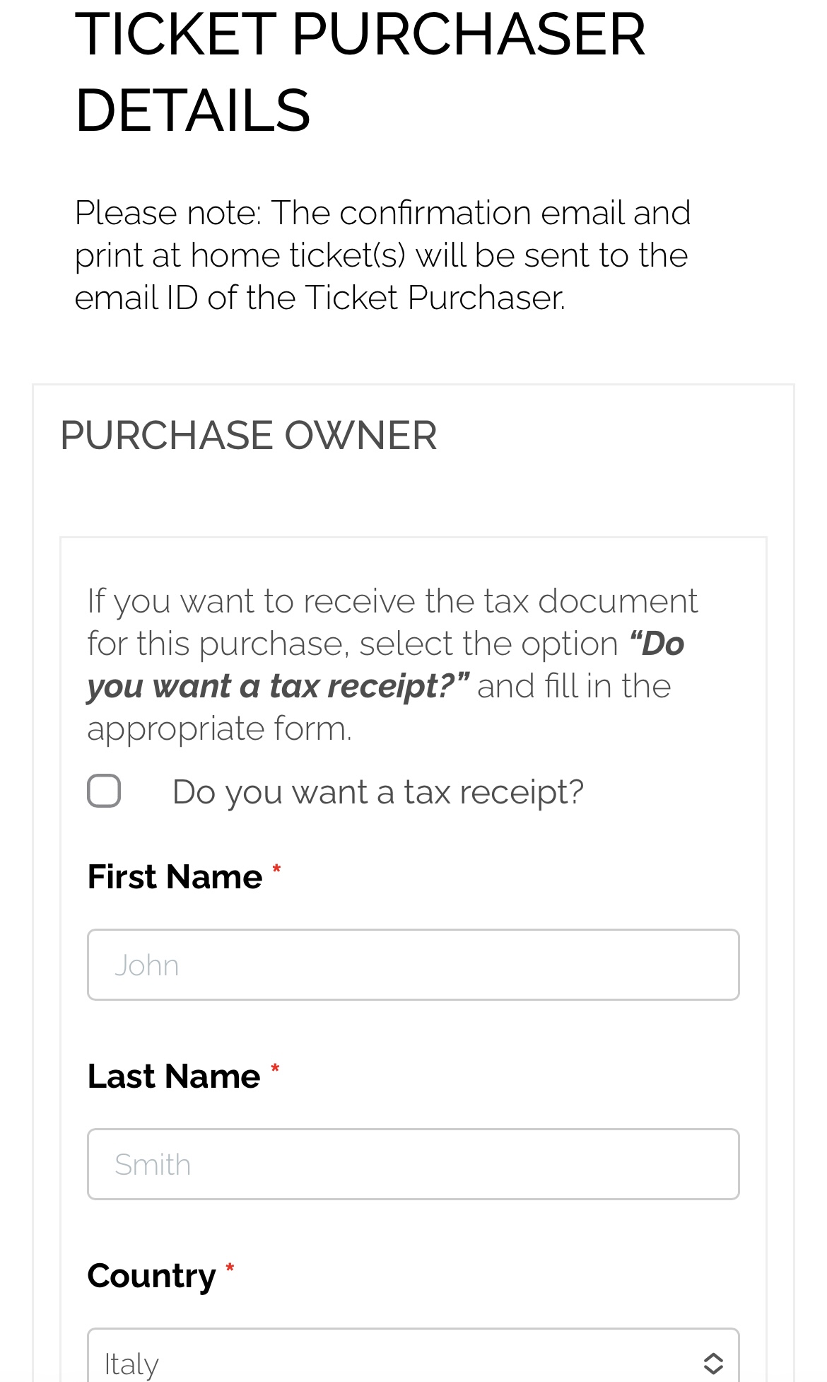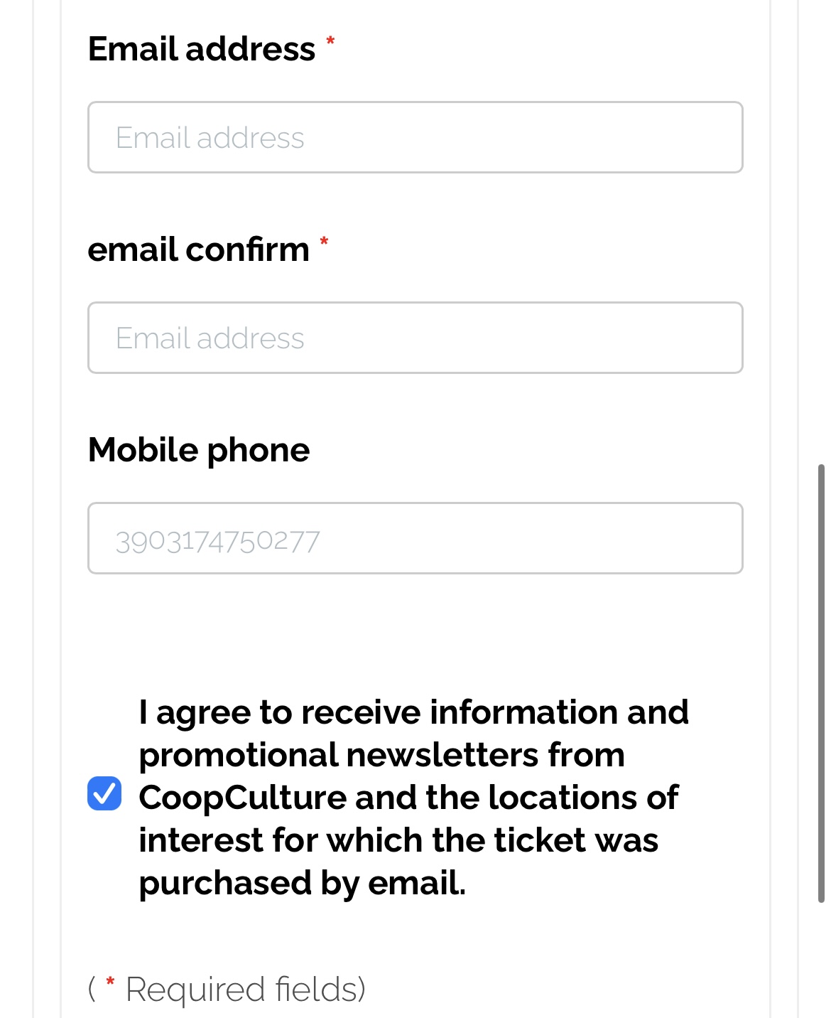 예매자의 정보를 적는 칸이 나온다. 성, 이름, 나라, 이메일주소, 이메일주소 확인(앞의 이메일과 같게 적으면 됨), 휴대폰 번호를 적는다. 나중에 이메일 주소로 바우처가 오기 때문에 본인이 확인할 수 있는 이메일을 정확하게 넣어줘야 한다.