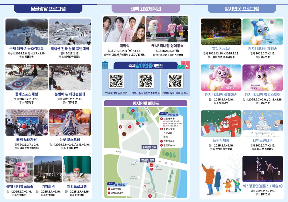 - 문의: 033-553-6900(태백시문화재단), 033-550-2828(관광안내소)
