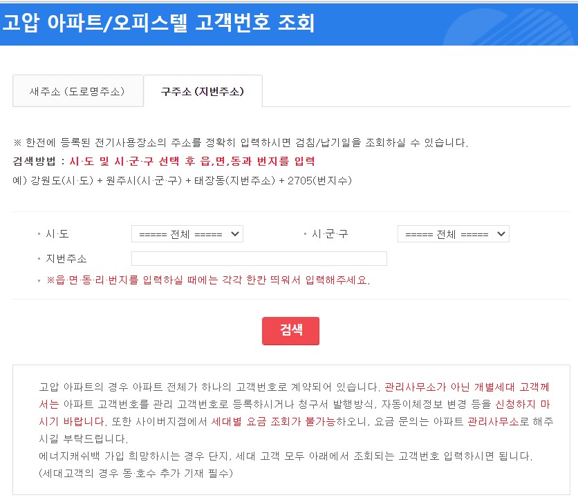 ☞ 아파트/오피스텔처럼 개별적으로 고객 번호가 없는 곳이라면 주소로 조회하면 별도의 인증 절차 없이 고객 번호를 조회가 가능합니다.