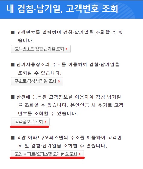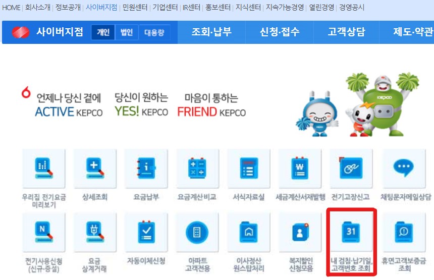 2. [한전 사이버지점] 메인에서 [내 검침일·납기일,고객 번호 조회] 클릭