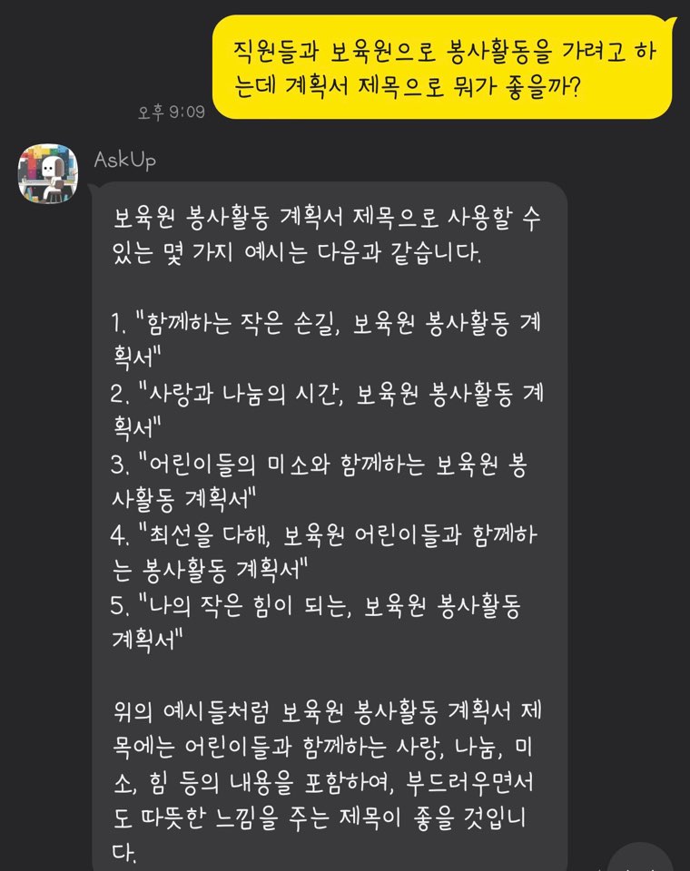 보고서 제목, 워크숍 명칭 등 굵직한 제목들을 무엇으로 할지 고민이시라면 아숙업을 이용하시기 바랍니다. 예를 들어 "직원들과 보육원으로 봉사활동을 가려고 하는데 계획서 제목으로 뭐가 좋을까?"라고 아숙업에게 질문한다면 10초도 안 돼서 5개의 계획서 제목을 알려줍니다.